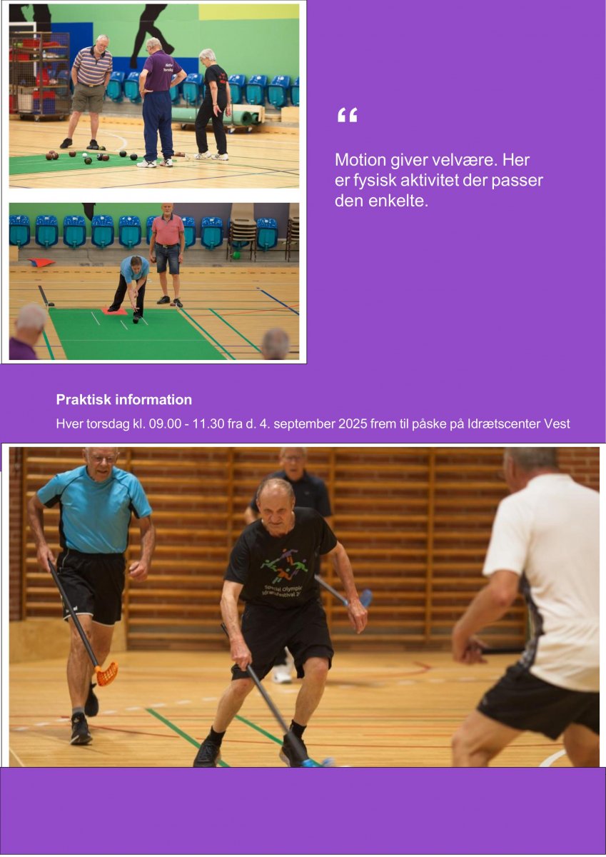 Vi tilbyderBadminton, Ballebold, Ballroom-fitness, Bob, Boccia, Bordtennis, Bowls, Dart, Effekt-bolde, Elastik-træning, Fitness, Floorball, Frisbee-golf, Hockey, Hulahopringe, Klunkespil, Krocket, New Age Kurling, Ogo, Petanque, Ringo, Shuffelboard, Sjipning, Skumbowling, Soft-Hockey, Soft-tennis, Stavgang, Vikingespil, Vippebræt, Volleyball,